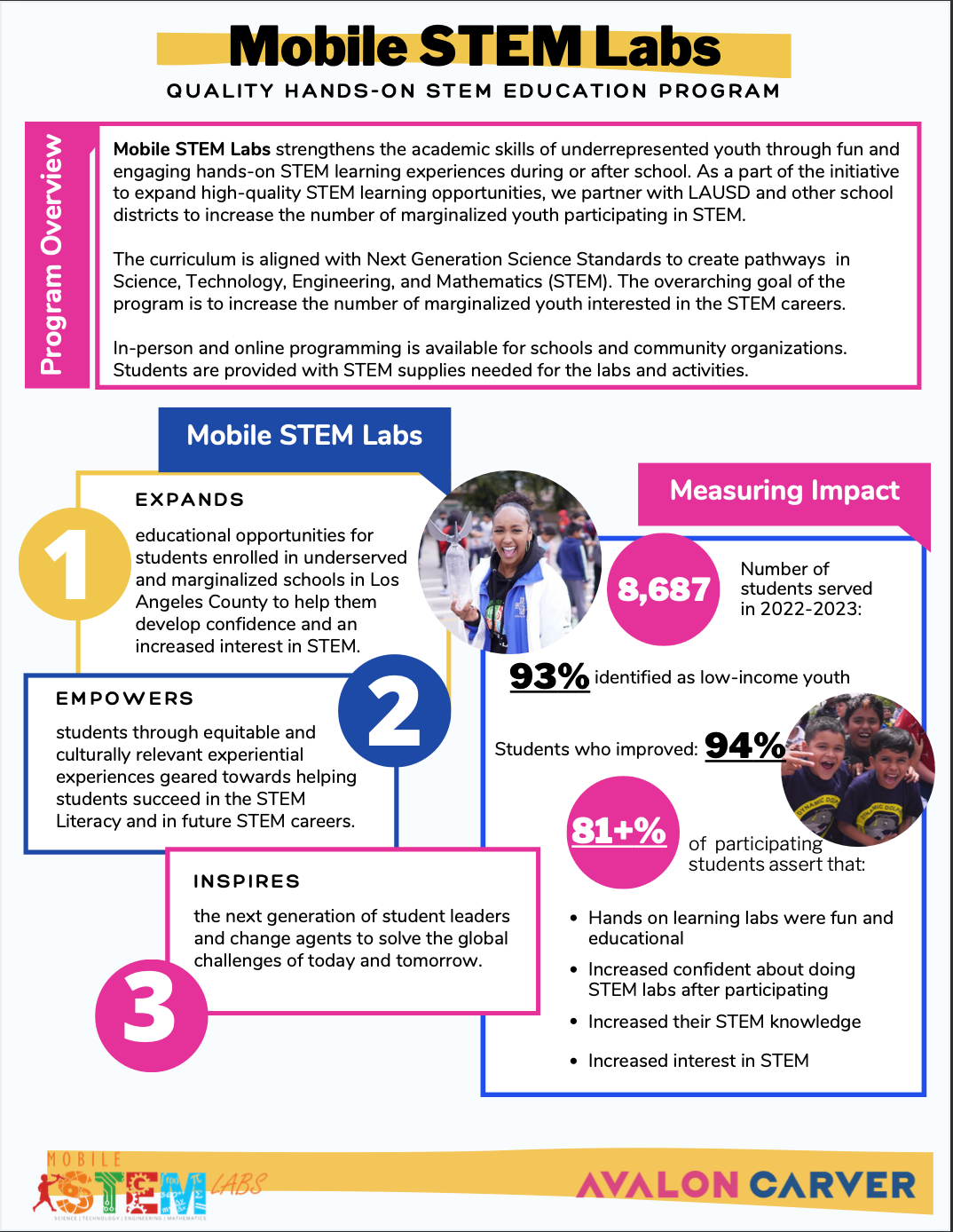 Avalon Carver’s Mobile STEM Labs (MSL) is committed to educational reform that invests in experiential STEM learning opportunities for under-resourced communities. To that end, we are dedicated to helping LAUSD achieve educational equity for all its students, but especially for those who are underrepresented in STEM careers. Our goal is to build a strong, diverse, and socially conscious tech workforce by leveling the playing field by delivering high quality STEM education for Black and Latinx students. We envision a world where every student, regardless of their zip code, can participate and thrive in a digital and global economy.
